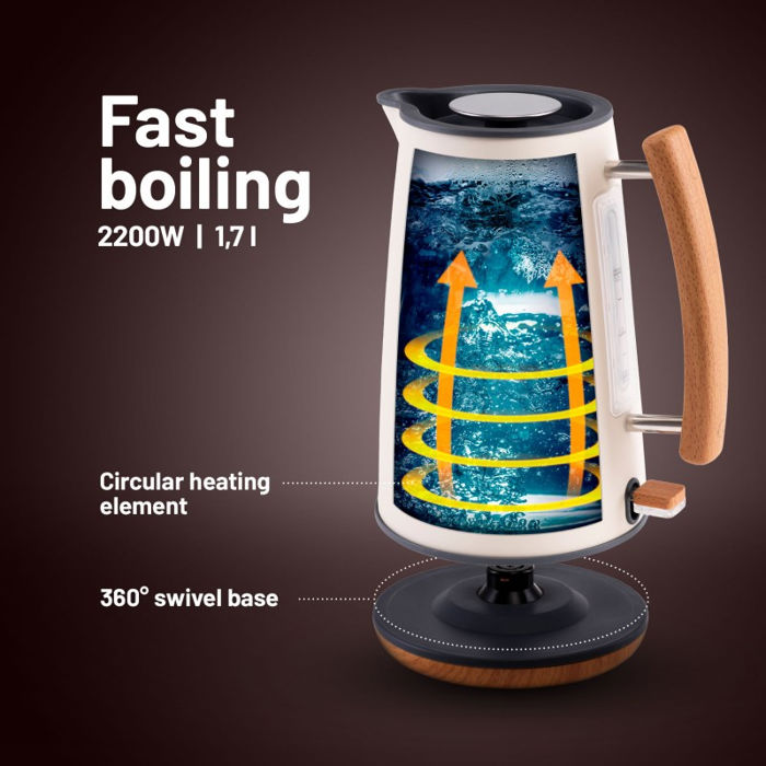 Kuhalo za vodu zasigurno je neizostavan predmet u svakoj kuhinji. Također može biti elegantan dodatak koji će dodati više vrijednosti vašem interijeru. Lauben električni kuhalo za vodu 17CR je dizajnersko kuhalo za vodu, dizajnirano u čistom nordijskom stilu, izrađeno od nehrđajućeg čelika #304 s savršeno gumiranom površinom. Kuhalo za vodu je jednostavno za održavanje, grijaći element je skriven, pa se manje prlja, a kuhalo se lakše čisti. Također smo imali na umu sigurnost, kuhalo ima zaštitu od pregrijavanja i vrenja bez vode. Trenutnu temperaturu vode možete vidjeti na termometru na kuhalu za vodu. Kuhalo za vodu izgleda dobro zahvaljujući svom dizajnu, ali je i praktično. Baza se može rotirati za 360° za jednostavno spremanje, a ne treba ni spominjati da zahvaljujući rotirajućem podnožju kuhalo za vodu možete lako rukovati i pomicati.