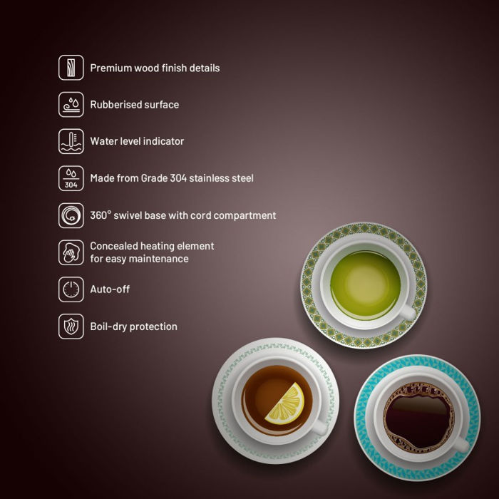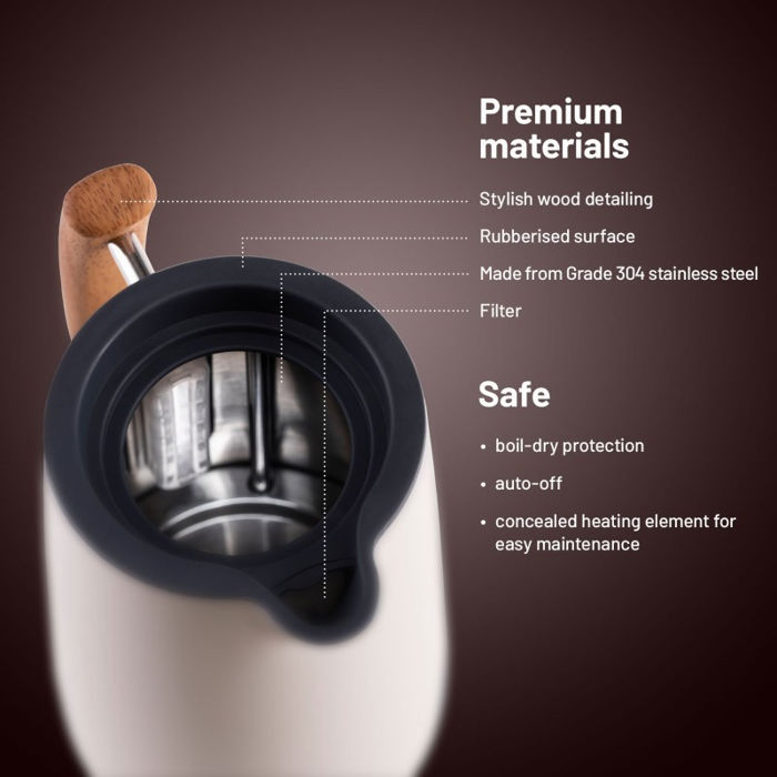 IKONE Izvanredan dizajn - Lauben grijač je dizajniran u ukusnom nordijskom stilu koji će se lijepo isticati u vašoj kuhinji Skriveni grijač – Grijaći element grijača je skriven, manje se prlja i kamenac ni tu nema šanse. Sigurnosne zaštite – Grijač je opremljen zaštitom od pregrijavanja i kuhanja bez vode. Indikator količine vode – Na ugrađenom indikatoru možete pratiti trenutnu količinu vode u grijaču. Prostor za kabel – Kabel koji smeta na pultu može se lako pohraniti u namjenski prostor u podnožju grijača. 360° rotirajuća baza – Zahvaljujući rotirajućoj bazi, možete lako rukovati i pomicati čajnik. Kvalitetan materijal – Tijelo grijača izrađeno je od nehrđajućeg čelika #304 s gumiranom površinom. LED rasvjeta – Glavni prekidač grijača ima LED rasvjetu.