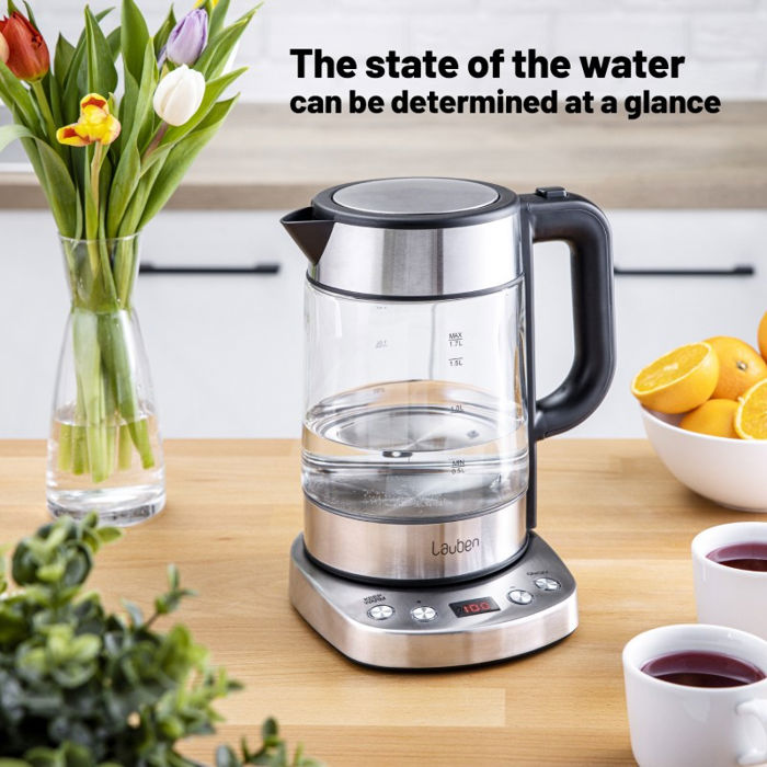 Lauben električno kuhalo za vodu EK17GS je dizajnerski grijač vode za podesivu temperaturu grijanja i funkciju održavanja topline. Sigurno će vam se svidjeti opcija podešavanja temperature vode u kuhinji. Želite li skuhati zeleni čaj? Više nikada nećete morati čekati da se voda ohladi, samo odaberite željenu temperaturu na prozirnom LCD ekranu.