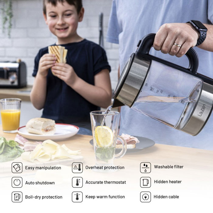 Na podnožju grijača nalazi se prozirni LCD zaslon koji prikazuje trenutnu temperaturu vode u grijaču. Neosporna prednost Lauben električnog kuhala za vodu je uklonjivi filtar koji se može prati, što smanjuje rizik od stvaranja kamenca. Grijač se vrlo jednostavno čisti i održava, a zahvaljujući ugrađenom pretincu za kabel neće vam smetati na kuhinjskom pultu.