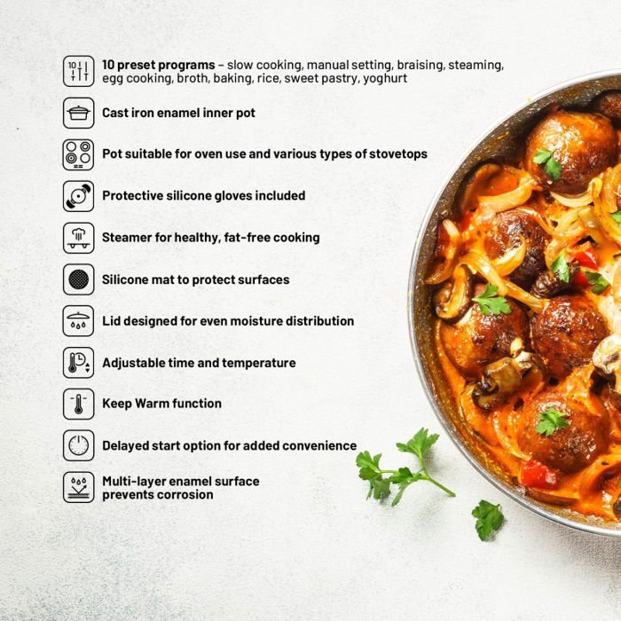Lauben OvenSafe® Multicooker 6000RS – svestrani pomoćnik za moderno kućanstvo Višenamjenski Lauben OvenSafe® Multicooker 6000RS ne ispunjava svoju oznaku. Unutarnji lonac je od pravog lijevanog željeza s emajliranom površinom - baš kao kod bake! Zahvaljujući OvenSafe® tehnologiji, lako se stavlja u pećnicu ili stavlja na različite vrste štednjaka, može izdržati temperature do 250 °C. Budući da je 21. stoljeće u punom jeku, posudu od 6 l možete ubaciti iu višenamjenski lonac i na raspolaganju će vam biti 10 unaprijed postavljenih programa za jednostavno i brzo kuhanje. Temperatura i vrijeme mogu se podesiti i ručno. Važna komponenta lonca je poklopac koji je dizajniran za ravnomjernu raspodjelu vlage unutra. Lijevano željezo savršeno upija i provodi toplinu, što kuhanje čini energetski učinkovitijim, a emajlirana površina sprječava koroziju. Također možete jednostavno pripremiti obrok na pari uz pomoć priloženog kuhala za kuhanje na pari. Funkcije održavanja temperature i odgođenog starta također su praktični pomagači. Priložene silikonske rukavice i podloga olakšat će rukovanje, a kuharica vam donosi inspiraciju. Ukusno i ekonomično Sastavni dio električnog višenamjenskog lonca je OvenSafe® emajlirani unutarnji lonac od lijevanog željeza otporan na temperature do 250 °C te pogodan za korištenje u pećnici ili na raznim vrstama štednjaka. Lijevano željezo može se pohvaliti sposobnošću upijanja topline i prijenosa je na sastojke koji se nalaze u njemu, a koji se tako pripremaju na konstantnoj temperaturi. Omogućuje vam uštedu energije, a time i novca. Sočnost i hrskavost jela osigurava poseban poklopac koji je dizajniran za ravnomjernu raspodjelu vlage unutar posude. Jednostavno i brzo kuhanje Višenamjenski lonac od 6 l nudi 10 unaprijed postavljenih programa - sporo kuhanje, ručno podešavanje, pirjanje, kuhanje na pari, gulaš, pečenje, riža, kolači, jogurt. Temperatura i vrijeme mogu se podesiti i ručno pomoću programa. Funkcija odgođenog početka pomaže vam u planiranju pripreme obroka tako da je sve već kuhano kada dođete kući. Tu je i funkcija Keep Warm koja održava jelo toplim bez kuhanja. Zdravo i sigurno U višenamjenskom loncu možete kuhati na najzdraviji način, tj. bez masnoće i na pari zahvaljujući posebnom kuhalu za kuhanje na pari koje je uključeno u paket. Priprema hrane također je vrlo sigurna, koristite priložene sigurnosne silikonske rukavice i silikonsku podlogu prilikom kuhanja. Kako bi vam lonac zaista dugo služio, opremljen je višeslojnom emajliranom površinom koja sprječava hrđanje. Kuhanje s ovim pomoćnikom prava je igra, ali ako vam nedostaje malo inspiracije za početak, u priloženoj kuharici pronaći ćete jednostavne i zdrave recepte. IKONE OvenSafe® unutarnji lonac Emajlirani unutarnji lonac od lijevanog željeza veličine 6 l lako se izvadi i stavi u pećnicu ili na različite vrste štednjaka. Podnosi temperature do 250 °C. 10 programa Možete koristiti unaprijed postavljene programe: sporo kuhanje, ručno podešavanje, pirjanje, kuhanje na pari, pirjanje, pečenje, riža, kolači, jogurt. Temperaturu i vrijeme možete podesiti i ručno. Posebna kapa Poklopac je dizajniran tako da se vlaga unutar posude ravnomjerno raspoređuje. Jela će biti sočna i hrskava.