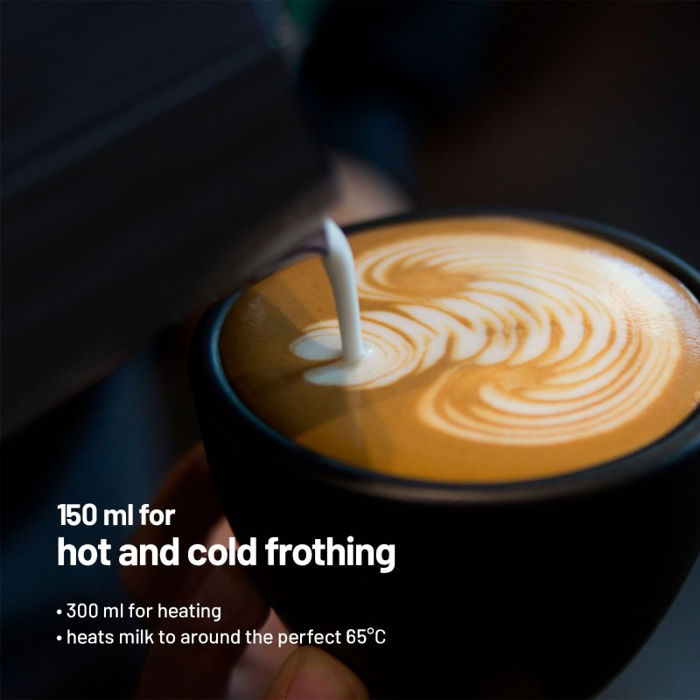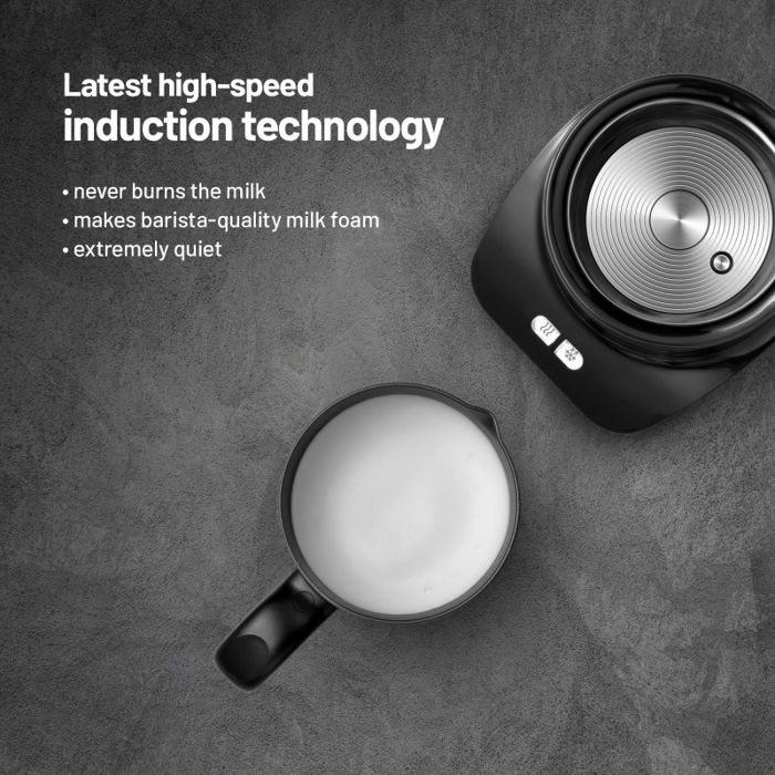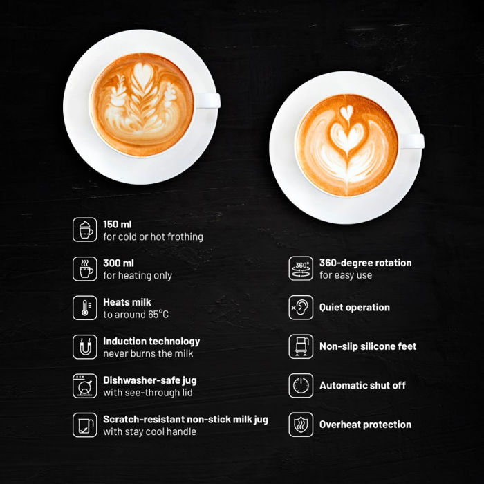 Svojstva 150 ml – Dovoljan volumen za zagrijavanje tople ili hladne pjene 300 ml – Zapremina za zagrijavanje mlijeka bez pjene, na primjer za baby kakao Idealna temperatura – Naprava za pjenjenje uvijek zagrijava ili pjeni mlijeko na pravu temperaturu od 60-75 stupnjeva. Bez sirenja - Zahvaljujući tehnologiji indukcijskog grijanja, mlijeko se nikada ne siri. Lako održavanje - Posuda za grijanje može se lako prati u perilici posuđa. Neprianjajuća površina - Posuda za grijanje ima posebnu površinu koja sprječava lijepljenje ili habanje. Tih rad - Uređaj radi vrlo tiho pa ćete svoju omiljenu kavu moći pripremati i u zoru. Gdje ćete ga postaviti... – Zahvaljujući neklizajućim nožicama, pjenilica uvijek stoji na svom mjestu.