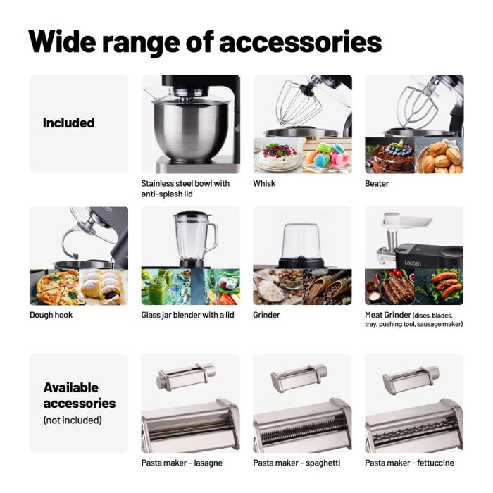 ? glavna inox zdjela veličine 5,5 l s poklopcem za dodavanje sastojaka tijekom pripreme ? metlica za mućenje ? nastavak za miješanje ? kuka za gnječenje ? Stakleni blender od kaljenog stakla od 1,5L s poklopcem za dodavanje sastojaka tijekom miješanja ? stroj za mljevenje mesa ? nastavak za pravljenje kobasica i ćevapa ? mala sjeckalica Ako vam nedostaje ljetovanje u Italiji, dočarajte si domaću tjesteninu uz pomoć dodataka koji se mogu kupiti: ? Lauben kuhinjski aparat za pripremu lazanja 12BCWT ? Lauben kuhinjski aparat za pripremu fettuccina 12BCWT ? Lauben kuhinjski aparat za špagete 12BCWT