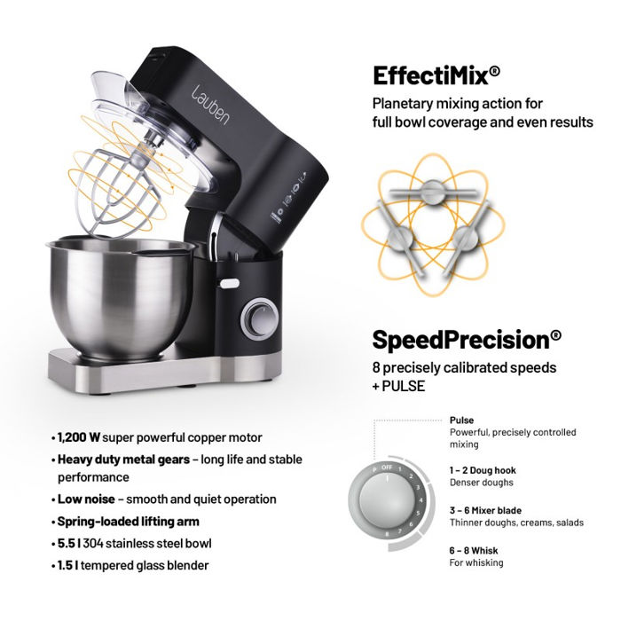 Moderan i funkcionalan u isto vrijeme Kuhinjski aparat Lauben ima tehnologiju EffectiMix?, koja osigurava planetarno miješanje i ravnomjeran rezultat. Stabilnu snagu od 1200 W osigurava pouzdan bakreni motor s visokootpornim potpuno metalnim zupčanicima, koji unatoč svojoj snazi ??zadovoljava niskom razinom buke. Isticat će se u vašoj kuhinji i s estetskog gledišta, što dokazuje i prestižna nagrada IF Design. Dostupan je u dvije verzije boja.