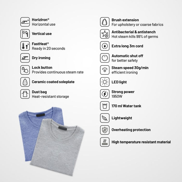 Brzo organizirajte odjeću čak i dok ste u pokretu Nema vremena koje možete priuštiti da gubite, stoga je tu tehnologija FastHeat® koja će odmah pokrenuti vaše glačalo na paru. Uz njegovu pomoć uređaj je spreman za rad unutar 20 sekundi od uključivanja, bez obzira gdje se nalazite. Ponekad pri ruci nema ni vješalice ili je površina toliko velika da tradicionalno glačanje postaje nepotrebno. Tu na scenu dolazi HorizIron® tehnologija s kojom ćete postići savršene rezultate čak i horizontalnim glačanjem na paru ili suhim glačanjem.