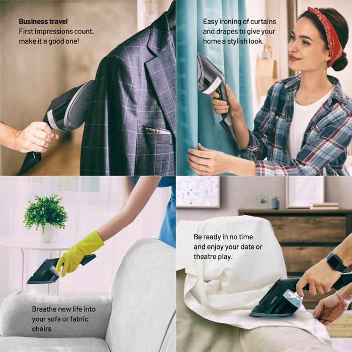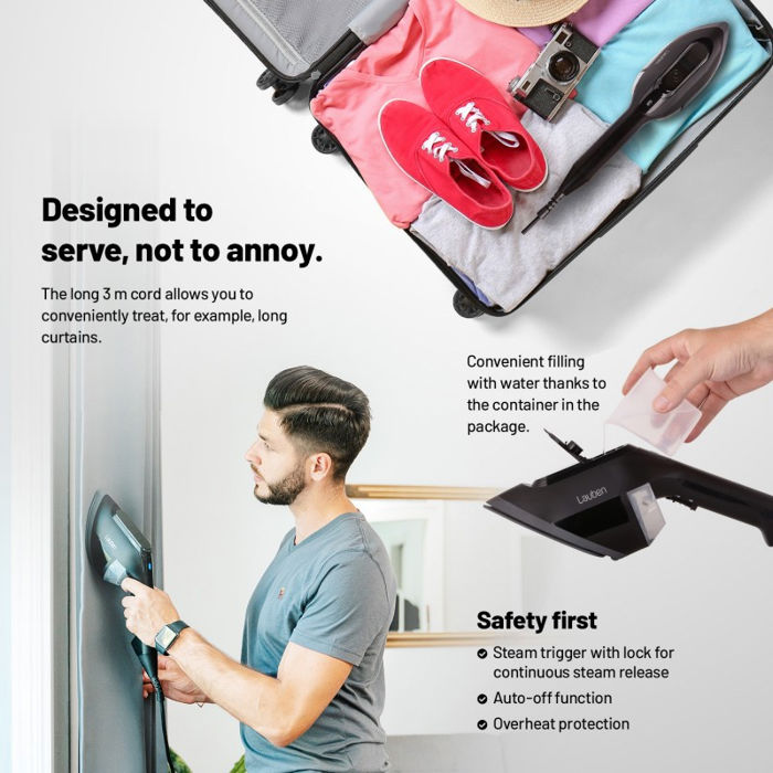 Moderna tehnologija za brzinu i učinkovitost Lauben Handheld Steam Iron 1950BC u potpunosti će zamijeniti klasično glačalo i neće stati na tome. Vruća para dezinficira površine, učinkovito se bori protiv bakterija i neugodnih mirisa. U kućanstvu je pogodan i za glačanje zavjesa ili osvježenje tapeciranog namještaja za čije čišćenje ćete koristiti priloženu četku. Idete na spoj, žurite na posao ili ste u pokretu? S funkcijom Dry Ironing odjeću ćete osušiti u tren oka, a zahvaljujući dasci za glačanje koja završava u šiljci, moći ćete dohvatiti i teško dostupna mjesta, poput između gumba.