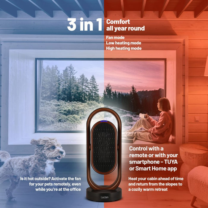 Lauben Smart Fan&Heater 2in1 1800BB – blistav suputnik zimi, osvježavajući ljeti Malo više topline pristaje u sumorne dane. Suputnik poput Lauben Smart Fan&Heater 2in1 1800BB grijat će vas kod kuće, vikendom ili u uredu. Udobno je prenosiv, a njegov vrhunski Lauben dizajn ugodan je oku. Nudi dvije razine temperature, a PTC keramički grijaći element osigurava sigurnost u kombinaciji s visokom i energetski učinkovitom izvedbom. Za vrućih dana uređaj će se transformirati u ventilator s prirodnim hlađenjem cirkulacijom zraka. Svidjet će vam se dizajn bez oštrica koji je siguran za djecu i kućne ljubimce. Sigurnost osiguravaju i štitnici od pregrijavanja i prevrtanja. Uređaj snage 1800 W pokriva do 20 m2, uključuje timer te mogućnost vertikalnog i horizontalnog pomicanja. Smart Home i Tuya aplikacije omogućuju daljinsko upravljanje, znate li što ugodnije od povratka u topli vikend nakon šetnje? Svojim mobilnim telefonom možete rashladiti spavaću sobu na katu dok uživate u piću u vrtu u vrućoj ljetnoj večeri. Koristit ćete daljinski upravljač u blizini ili tipke na uređaju. Grijanje i hlađenje u jednom Lauben Smart Fan&Heater 2in1 1800BB će vas svojom snagom od 1800 W dobro zagrijati u hladnim danima i ugodno rashladiti u vrućim ljetnim danima. Način grijanja omogućuje dvije postavke temperature (nisku i visoku), a PTC keramički grijaći element osigurava siguran rad i visoku energetski učinkovitu izvedbu. Način rada ventilatora za hlađenje iskorištava prirodnu cirkulaciju zraka, a dizajn bez lopatica čini ga sigurnim za djecu i kućne ljubimce. Savršeno 2u1 rješenje. Pametno rješenje Također ćete jednostavno upravljati pametnim grijačem i ventilatorom na daljinu putem aplikacije Smart Home ili Tuya. Želite li predgrijati ured u sumorno jesensko jutro? Bit će potrebna samo dva klika na mobitelu na putu do posla. Imate kućnog ljubimca i želite da mu je ugodno samom kod kuće? Uključite ventilator da mu bude lakše u ljetnim danima. Također možete koristiti daljinski upravljač ili gumbe izravno na grijaču u blizini uređaja. Ako želite malo dodatnog grijanja noću, praktičan će biti tajmer koji će automatski isključiti grijač nakon 2, 4 ili 8 sati. Praktično i sigurno Savršen high-end Lauben dizajn zasjat će u svakoj prostoriji, 20 m2 pokrivenosti lako će se postići uz pomoć širokog kuta zakretanja, jer se horizontalno okreće pod kutom od 80°, a pomiče gore-dolje pod kutom od 45°. Ali nisu važni samo funkcionalnost i dizajn, sigurnost je na prvom mjestu. Za to će se pobrinuti dvostruka zaštita od pregrijavanja i zaštita od prevrtanja koja će isključiti uređaj u kriznoj situaciji.