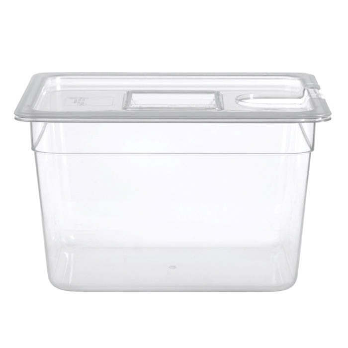 Lauben Sous Vide Posuda 12 posuda Lauben Sous Vide posuda praktičan je dodatak za Sous Vide kuhanje. Koristeći ga, nikada nećete morati dodavati vodu u vodenu kupelj, čak ni tijekom nekoliko sati kuhanja. Dakle, ako ostavite svoje sous vide kuhalo uključeno preko noći, neće biti alarma za nisku vodu koji bi vam smetali. Osim što navlaka sprječava isparavanje vode, ona također pomaže boljem održavanju temperature i sprječava gubitak topline. U usporedbi sa sous vide kuhanjem u klasičnom loncu, vakumirane vrećice bolje će ostati na mjestu i neće lebdjeti iznad površine, što će pomoći da se hrana ravnomjerno obradi. Posuda i poklopac izrađeni su od ultračvrstog polikarbonata koji udovoljava najstrožim sigurnosnim zahtjevima i naravno potpuno je neškodljiv za vaše zdravlje. Dok je vodi potrebno više vremena da se zagrije u metalnoj posudi zbog svoje vodljivosti, Lauben Sous Vide učinkovitije održava vodu toplom i potrebno je manje vremena za zagrijavanje vodene kupelji na željenu temperaturu. Zahvaljujući visokoj stabilnosti korištenog materijala, može se prati u perilici posuđa.