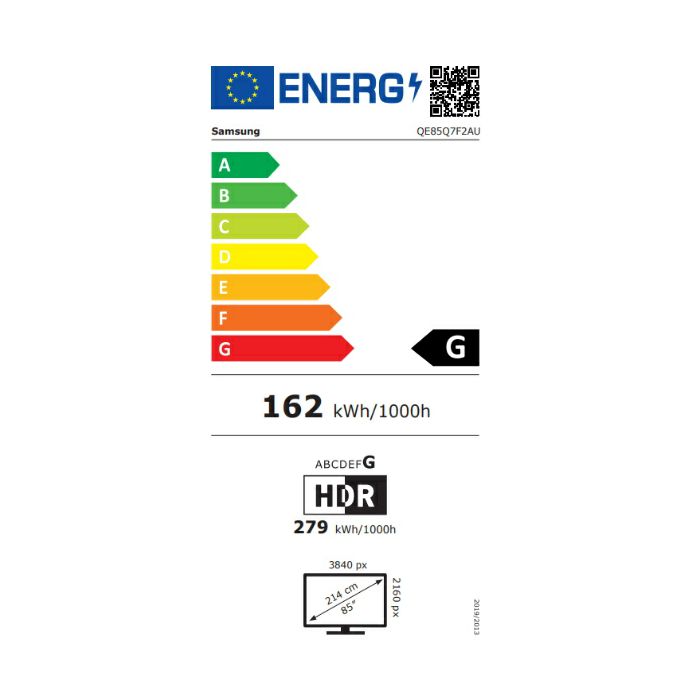 Sepcfikacije: Vrsta proizvoda: QLED Veličina ekrana: 85" Rezolucija: 4K (3.840 x 2.160) Brzina osvježavanja: 50Hz Anti refleksija: Nema Video Pokretač slike: Q4 AI procesor HDR (Visoki dinamički raspon): Quantum HDR HDR 10+: Podrška Auto HDR Remastering: Nema Kontrast: Mega kontrast Kut gledanja: Nema Micro Dimming: Supreme UHD Dimming Enhancer kontrasta: Da Tehnologija pokreta: Motion Xcelerator Pametno podešavanje slike: Osnovno Usklađivanje slike: 4K usklađivanje AI Motion Enhancer: Nema Supersize Picture Enhancer: Nema HDR Brightness Optimizer: Da Booster boje: Color Booster Pro Filmmaker Mode: Da EyeComfort Mode: Nema Audio Dolby Atmos: Nema Object Tracking Sound: OTS Lite Q-Symphony: Da Pre-selekcija zvuka: Da Izlaz zvuka (RMS): 20W Vrsta zvučnika: 2CH Aktivni pojačivač glasa: Nema Adaptive Sound: Da 360 Audio: Nema Pametna usluga Operativni sustav: Tizen™ Smart TV Bixby: Da Daljinsko glasovno upravljanje: Nema Ugrađeni glasovni asistent: Alexa (GB, DE, FR, IT, ES, AT, IE) Rad s AI zvučnikom: Alexa (GB, DE, FR, IT, ES, AT, IE), Google Assistant (GB, FR, DE, IT, ES, CH, AT, NL, SE, NO, DK, FI, PT, IE, BE, LU) Samsung TV Plus: Da (GB, FR, DE, IT, ES, CH, AT, NL, SE, NO, DK, FI, PT, IE, BE, LU) Web preglednik: Da SmartThings Hub / Matter Hub / IoT-Sensor funkcionalnost / Brzi daljinski upravljač: Da Samsung Health: Da (GB, IE samo) Univerzalni vodič: Da (GB, FR, DE, IT, ES) Pametna funkcija Multi Device Experience: Mobilni uređaj na TV, TV inicira zrcaljenje, zvučno zrcaljenje, bežični TV Multi-View: do 2 videozapisa Ambient Mode: Nema ConnecTime: Nema ScreenVitals: Nema Apple AirPlay: Da (osim Aland Islands, Faroe Islands, Netherlands Antilles, San Marino) Daily+: Da Storage Share: Da Live Translate: Nema Click to Search: Da (DE, GB, FR, ES, IT) Generative Wallpaper: Da Karaoke Mic: Da Google Cast: Nema Lokalizacija Tune Station: Nema S-Share: Nema Značajke za igre Auto Game Mode (ALLM): Da Game Motion Plus: Da VRR: Nema Dynamic Black EQ: Nema Surround Sound: Nema Super Ultra Wide Game View: Da MiniMap Zoom: Da Hue Sync: Da (AT, BE, DK, FI, FR, DE, IT, NL, NO, PT, ES, SE, CH, GB) FreeSync: Nema HGiG: Da Gaming Hub: Da (KR, US, CA, BR, GB, FR, DE, IT, ES, MX, AU) AI Auto Game Mode: Da Tuner/Emitiranje Digitalno emitiranje: DVB-T2CS2 Analogni tuner: Da 2 Tuner: Nema CI (Common Interface): CI+(1.4) / CI+(1.4 ECP) - IT samo Podaci o emitiranju: HbbTV 2.0.4 (IT, GB, DE, CZ, SK, ES, PL, AT, FR, FI, EE, GR, SI, HR, BE, NL, LU, HU, CH, PT, DK, ME) TV ključ: Da Povezivost Wi-Fi: Da (Wi-Fi 5) Bluetooth: Da (BT5.3) HDMI: 3 Maksimalna ulazna brzina HDMI: 4K 60Hz (za HDMI 1/2/3) HDMI Audio Return Channel: eARC One Connect Box: Nema Anynet+ (HDMI-CEC): Da USB: 1 x USB-A POGO (SlimFit Cam Only): Nema Ethernet (LAN): 1 Audio izlaz (Mini Jack): Nema Digitalni audio izlaz (Optički): Nema RF In (Terrestrial / Kabelski ulaz / Satelitski ulaz): 1/1 (Zajedničko za terestrijalno) / 1 Ex-Link (RS-232C): Nema CI Slot: 1 Dizajn Dizajn: Slim Look Vrsta okvira: 3 Bezel-less Boja prednje strane: Crna Vrsta postolja: FLAT FEET NARROW Boja postolja: Crna Dodatna značajka Auto rotacija: Nema Art Mode: Nema Art Store: Da Detekcija pokreta: Nema Knox Vault: Nema Ugrađeni POP: Da EPG: Da Prošireni PVR: Da (Belgija, Nizozemska, Luksemburg, UK, Irska, Španjolska, Portugal, Andora, Švedska, Danska, Norveška, Finska, Island, Francuska, Njemačka, Austrija, Švicarska) IP kontrola: Da OSD jezik: 27 europskih jezika + ruski (samo kada se povežete na mrežu u EE, LV, LT) V-Chip: Nema Snaga i ekološka rješenja Potrošnja energije (maks): 275 W Napajanje: AC220-240V~ 50/60Hz Potrošnja energije (stand-by): 0.50 W Potrošnja energije (energija ušteda): Nema Potrošnja energije (tipična): 162 W Godina potrošnje energije (EU standard): 225 kWh Eco senzor: Da Auto ušteda energije: Da Energetska učinkovitost: G Auto isključivanje: Da Dimenzije Pakiranje (WxHxD): 2075 x 1200 x 171 mm Dimenzije sa postoljem (WxHxD): 1901.2 x 1132.3 x 359 mm Dimenzije bez postolja (WxHxD): 1901.2 x 1088.4 x 61.4 mm Postolje (osnovno) (WxD): 1415.3 x 359 mm Postolje (minimalno) (WxD): 367.3 x 359 mm VESA specifikacija: 600 x 400 mm