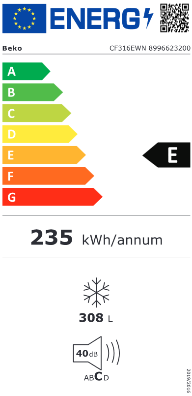 Visina: 84.5 cm Širina: 112 cm Dubina: 70 cm Klasa energetske efikasnosti: E Tip rashladnog sustava: statički Boja: bijela Klasa emisije zvuka: C Ukupna zapremina zamrzivača (l): 308 Dnevni kapacitet zamrzavanja (kg/dan): 16 Košara: 1 Godišnja potrošnja električne energije (kWh/godišnje): 234.82 Nivo buke (dBA): 40 dBA Klimatska klasa: SN-T