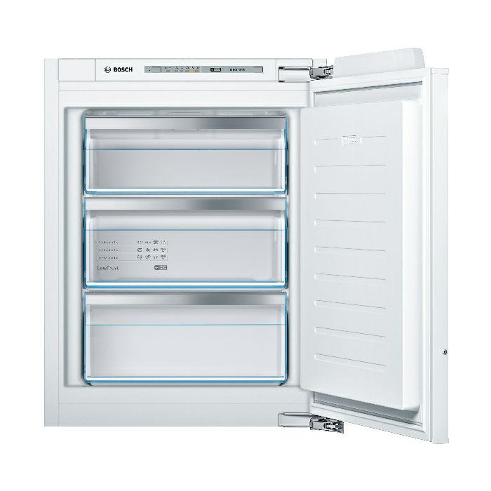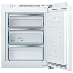 Bosch GIV11AFE0 Ugradbeni zamrzivač Low Frost Plosnata šarka Elektronička regulacija temperature s LED prikazom Akustični alarm, Optički sigurnosni sustav ****- Prostor za zamrzavanje: 72 l Učinak zamrzavanja: 8 kg/24 h Pohranjivanje u slučaju kvarova: 21 h Broj prozirnih pretinaca za zamrzavanje: 3 Desno otvaranje vrata, podesivo Klimatski razred SN-T Priključna snaga: 90 W Napon: 220-240 V Ugradbene dimenzije (V x Š x D): 72 x 56 x 55 cm Dimenzije (V x Š x D): 71 x 56 x 55 cm Država porijekla: Njemačka