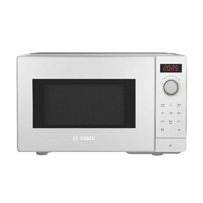 Bosch FFL023MW0 Samostojeća mikrovalna pećnica, bijela Okretni gumb za upravljanje AutoPilot 7 LED svijetlo Bočno otvaranje, na lijevo Gumb za otvaranje vrata Dječja sigurnosna brava Sigurnosno isključivanje Kontaktni prekidač za vrata Ventilator za hlađenje Dužina kabela za napajanje: 130 cm Dimenzije (VxŠxD): 260 mm x 442 mm x 345 mm Država porijekla: Kina