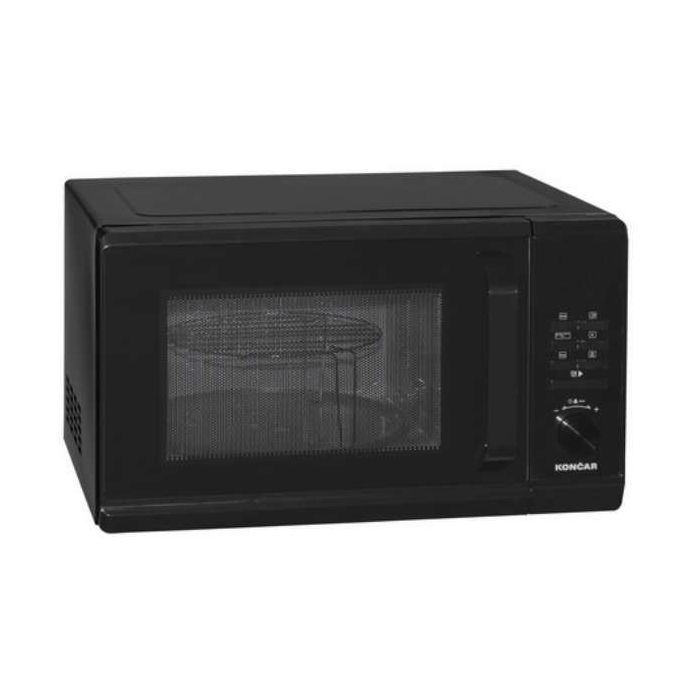 Končar M23CEG Mikrovalna pećnica Boja: crna Visina x Širina x Dubina (mm): 288x485x401 Kapacitet pećnice (l): 23 Nazivna mikrovalna snaga izlazna/ulazna (W): 800/1250 Gril grijač (W): 1000 Više razina mikrovalne snage Vrijeme pripreme hrane Funkcija odleđivanja LCD zaslon Promjer tanjura (mm): 270 Neto težina (kg): 13