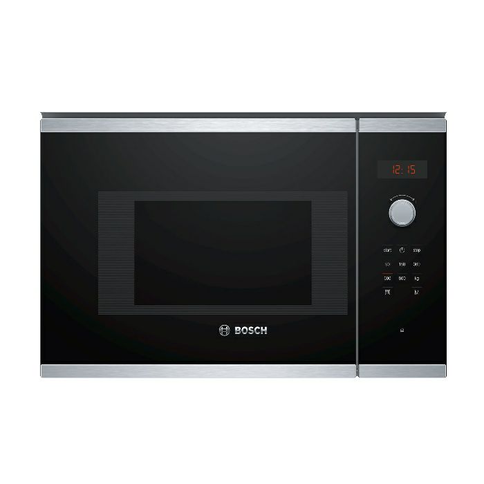 Bosch BFL523MS0 Ugradbena mikrovalna pećnica, 60 x 38 cm Maksimalna snaga: 800 W; 5 postavke mikrovalne: 90 W, 180 W, 360 W, 600 W, 800 W Zapremina: 20 l Unutrašnjost od nehrđajućeg čelika Upravljanje s LED ekranom Elektronički tajmer Okretni gumb za upravljanje, Utisni gumb za upravljanje, TouchControl senzorsko upravljanje Jednostavno upravljanje, 2 regulatora koja se upuštaju AutoPilot 7 Broj programa odmrzavanja: 4; broj programa pečenja: 3 Memorijska funkcija (1 postavka) LED svijetlo Stakleni rotirajući tanjur, promjer 25.5 cm Bočno otvaranje, na lijevo Gumb za otvaranje vrata Rad s pomoću tipki na dodir Sigurnosno isključivanje Kontaktni prekidač za vrata Ventilator za hlađenje Dužina kabela za napajanje: 130 cm Dimenzije (VxŠxD): 382 mm x 594 mm x 317 mm Dimenzije niše (VxŠxD): 362 mm - 365 mm x 560 mm - 568 mm x 300 mm Država porijekla: Kina