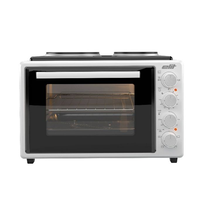 Tehničke informacije Snaga: 1400W Napajanje: 220-240 V, 50-60 Hz Kapacitet: 35 litara Dimenzije: 505x325x373 mm Prva ploča: 1000W Druga ploča: 1500W Istovremeni rad ploča za kuhanje: Da Okretni ražanj: Da Unutrašnje svjetlo u pećnici: Da Funkcije: 0+4 Timer: Mehanički Termostat: Da Vrata pećnice: Dvostruka staklena Donji grijaći elementi: Skriveni Dodatna oprema: 1 četvrtasti pladanj 1 Cr-Ni rešetka Boja: Bijela