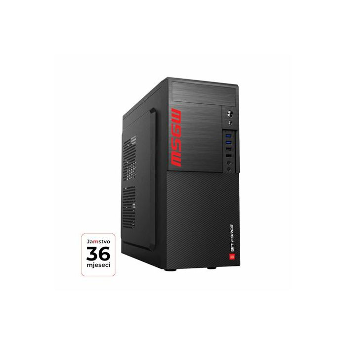 MSGW Basic R5 a109 računalo bazirano je na AMD Ryzen 5 5600GT procesorui ASUS matičnoj ploči sa AMD A520 chipsetom. Uz navedeno tu je i 16 GB brze DDR4 memorije i brzi M.2 SSD disk 1TB. Sa svojom snažnom grafičkom karticom,brzim SSD diskom i velikom količinom radne memorije ,pojednostavit će svakodnevno korištenje standardnih programa. Osnovne karakteristike: OS: Free DOS CPU tip: AMD Ryzen™ 5 CPU brand: AMD CPU model: 5600GT CPU brzina [GHz]: 3,60 L2 Cache: 3 MB L3 Cache: 16 MB Chipset: AMD A520 Socket: AM4 Količina memorije: 1x 16 GB Tip memorije: DDR4 Takt memorije [MHz]: 3200 Broj memorijskih utora: 2 Maksimalna količina memorije [: 64 Grafička kartica: Integrirana Model grafičke kartice: Radeon™ Graphics Tip diska: M.2 PCIe Veličina diska [GB]: 1000 Broj okretaja diska: n/a Optički uređaj: Nema Zvučna kartica: 8-kanalna Mrežna kartica - brzina [Mbit]: 1 Gbit/s Utori za proširenje: 1x PCIe 3.0 x16, 2x PCIe 3.0 x1 Interni konektori: 4x SATA III, 1x M.2 Socket 3, 2242/2260/228 Stražnji panel: 1x PS/2 mouse/keyboard combo, 1x HDMI, 1x VGA, 1x RJ45, 2x USB 2.0, 3x Audio konektor, 4x USB 3.2 Gen 1 Type-A Prednji panel: 1x USB 3.2 Gen 1 Type-A, 2x USB 2.0, Audio In/out Kućište - veličina: Midi Tower Napajanje [W]: 500 Ladica za uređaje 5,25" vanjsk: 1 Ladica za uređaje 3,5" interna: 2 Ladica za uređaje 2,5" interna: 2 Miš: Ne Tipkovnica: Ne Zvučnici: Ne