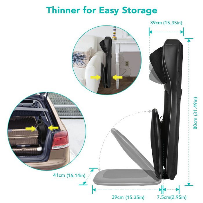 Prikladno za sve osobe - podešavanje veličine (6 cm), idealno za korisnike visine od 155 do 185 cm (bez ograničenja težine). 8 masažnih glava ravnomjerno masiraju cijela leđa te također masiraju posebne akupunkturne točke. Odgovara svakom interijeru ili automobilu. Potpuna kontrola - neovisno kontrolirajte masažu vrata i leđa; Masirajte cijela leđa ili samo gornji ili donji dio leđa. Odaberite između 3 različite razine vibracije za područje kukova. Sigurnost - 15-minutni tajmer s automatskim isključivanjem i zaštitom od pregrijavanja. Higijenski i tiho - periva navlaka i imitacija kože, koja se lako čisti vlažnom krpom.