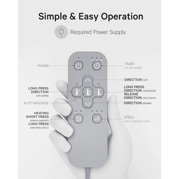- Praktično upravljanje postavkama: Pristupite svim postavkama funkcija masaže pomoću gumba na upravljaču i pronađite postavku koja je savršeno prilagođena vašim potrebama. Postavljanje omiljenog načina masaže jednostavnim kontrolama.