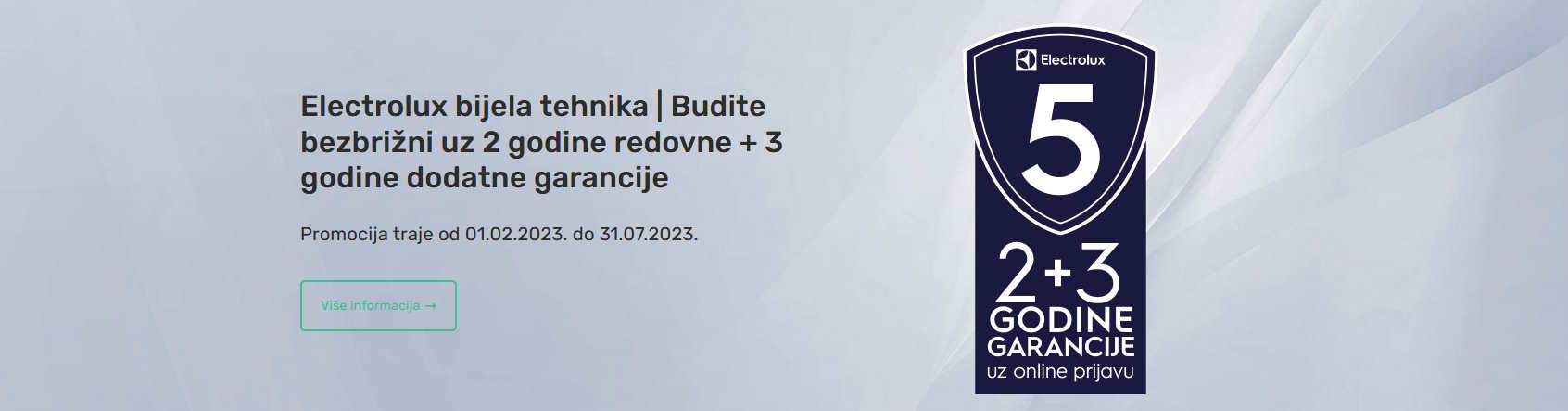 Electrolux bijela tehnika | Budite bezbrižni uz 2 godine redovne + 3 godine dodatne garancije Promocija traje od 01.02. do 31.12.2025. Kliknite na ikonu za detalje