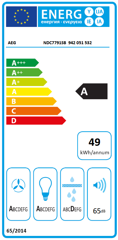 Razred energetske učinkovitosti: A Razred učinkovitosti filtera masnoće: D Godišnja potrošnja energije (KWh/godina): 49.1 Klasa dinamične učinkovitosti: A Razred učinkovitosti svjetla: A Učinkovitost dinamike zraka: 32.5 Učinkovitost filtriranja masnoće (%): 65.1 Učinkovitost rasvjete (lux/W): 39.3