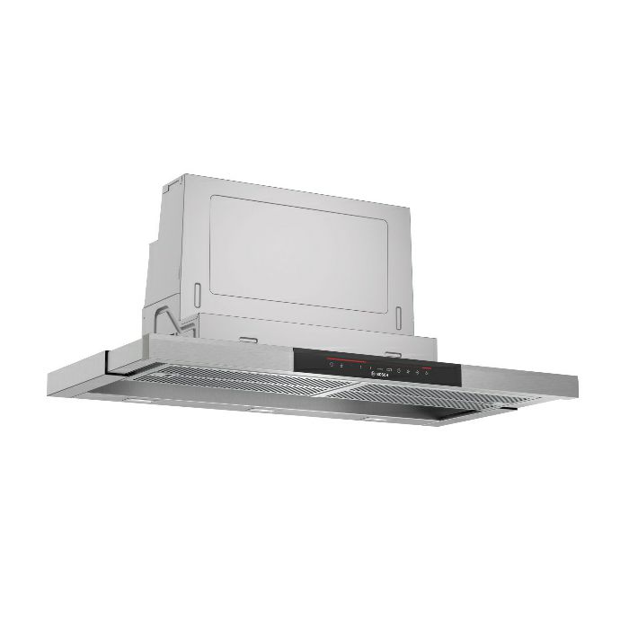 Bosch DFS097K51 Teleskopska kuhinjska napa, 90 cm Za ugradnju u viseći ormarić (širine 60 ili 90 cm) Dvije mogućnosti rada: odvod zraka ili kruženje zraka (potrebno dokupiti komplet za recirkulaciju) Elektronsko upravljanje, Lightline TouchControl upravljanje (5 stupnja učinkovitosti: 3 + 2 intenzivne) 5 stupnjeva učinkovitosti: 3 + 2 intenzivne Automatsko isključivanje intenzivnog stupnja 10-minutni pomak isključivanja Senzor kvalitete zraka Osvjetljenje polja za kuhanje: 3 x 1,5 W LED osvjetljenje Mogućnost podešavanje intenziteta osvjetljenja Postupno osvjetljivanje/zatamnjivanje SoftLight Temperatura boje: 3500 K Intenzitet svjetla: 355 lux Poklopac filtera od nehrđajućeg čelika, prikladan za čišćenje u perilici posuđa Metalni filter za masnoće, prikladan za čišćenje u perilici posuđa Indikator zasićenosti filtra (metalnoga ili ugljenoga) Protok zraka pri najvećoj mogućoj brzini pri normalnoj uporabi: 395 m3/h; pri intenzivnoj uporabi: 700 m3/h (prema normi EN 61591) Protok zraka (odvod zraka) pri najvećoj mogućoj brzini pri normalnoj uporabi: 395 m3/h; pri intenzivnoj uporabi: 700 m3/h (prema normi EN 61591) Stupanj protoka ispušnog zraka prema standardu EN 61591 maksimalno 395 m3/h Buka min./maks. normalna razina: 41/53 dB EcoSilenceDrive motor Dimenzije (VxŠxD): 426 x 898 x 290 mm Ugradbene dimenzije (VxŠxD): 385 x 524 x 290 mm Cijev O 150 mm, 120 mm sa jednosmjernim zatvorivim poklopcem Električni kabel duljine 1.75 m Razred energetske učinkovitosti: B (na skali energetskih razreda od A++ do E) Godišnja potrošnja energije: 38.8 kWh/god Razred učinkovitosti protoka zraka: B Razred učinkovitosti osvjetljenja: A Razred učinkovitosti filtriranja masnoća: B Priključna snaga: 146 W Država porijekla: Njemačka