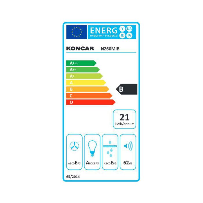 Končar NZ60MIB Napa za ugradnju ispod kuhinjskog elementa Boja: inox Visina x Širina x Dubina: 8 x 60 x 44 cm Spoj na ventilacijski otvor: 120 mm Upravljanje: okrugli prekidači Rasvjeta: 1×1,5W, LED Kapacitet isisavanja zraka: 190 m3/h Broj motora: 1 Stupnjevi isisavanja zraka: 3 Al filtri za masnoću: 1 Ugljeni filtar: (naručuje se posebno) Max snaga: 39,5 W Dimenzije zapakiranog proizvoda: 64 × 49,5 × 12,5 cm (ŠxDxV) Masa aparata neto/bruto: 4,5 / 5,7 kg