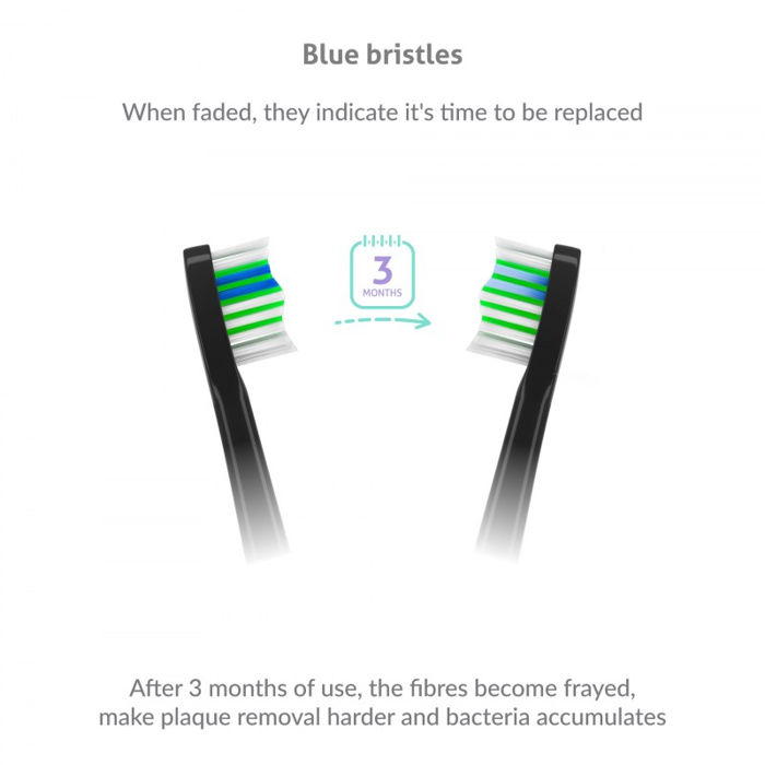 TrueLife SonicBrush Compact-series glave Standard black 2 pak Glava traje oko tri mjeseca korištenja, ali tada počinje hrđati, gubi učinkovitost i na njoj se skupljaju bakterije. Srećom, glave su opremljene plavim dlačicama koje izblijede nakon tri mjeseca i odmah znate da glavu treba zamijeniti.
