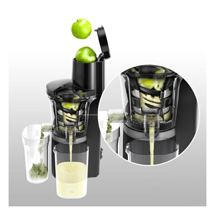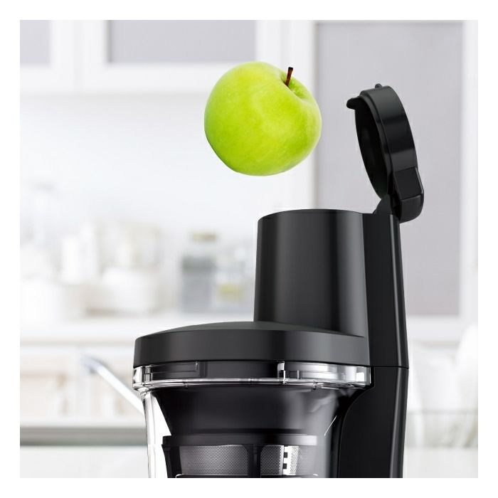Sok od cijelog voća Uštedite vrijeme tako što ne morate prvo nasjeckati voće. Otvor je širok 75 mm, tako da bez problema možete ubaciti cijele jabuke, kruške, kivi i sl. Voće i povrće umetnuto cijelo daje više okusa i zadržava hranjive tvari tijekom ekstrakcije zahvaljujući polaganom prešanju.