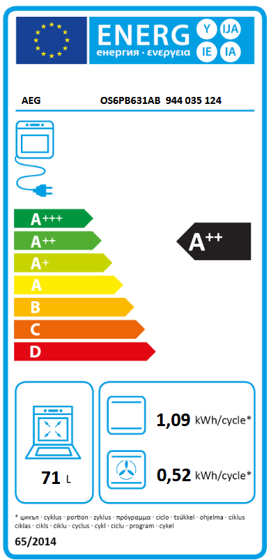 Klasa energetske učinkovitosti: A++ Indeks energetske učinkovitosti: 61.2 Potrošnja energije sa konvencionalnim načinom rada (kWh/ciklus): 1.09 Potrošnja energije u načinu rada s ventilatorom (kWh/ciklus): 0.52 Snaga žarulje (W): 40 Vrsta napajanja pećnice: električna