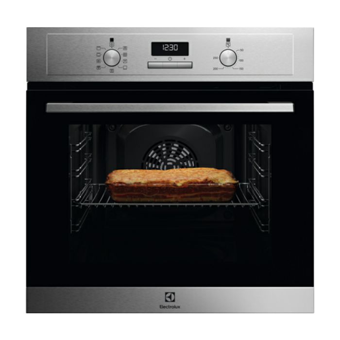 Electrolux EOF3H40BX Ugradbena Pećnica 600 SurroundCook sa ventilatorom Kapacitet: 65 l Energetska klasa: A Boja: inox sa premazom protiv otisaka prstiju SurroundCook - ravnomjerno grijanje pećnice vrućim zrakom LED interaktivni ekran, mehanički prekidači i kontrole na uvlačenje 9 funkcija Timer sa 5 podešenja Vrata sa 2 izolacijska stakla 1 Mousasaka plitica + 1 rešetka Pečenje u 2 razine Sat sa prograbilnim timerom Prikaz vremena: trenutno, trajanje Prikaz temperature: na regulatoru, indikator preostale topline AquaClean - čišćenje uz pomoć vlage Dimenzije u cm: 59 V x 59,4 Š x 56 D Zemlja porijekla: Poljska