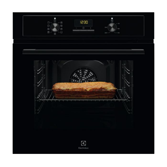 Electrolux EOF3H50BK Ugradbena Pećnica 600 SurroundCook sa ventilatorom Kapacitet: 65 l Energetska klasa: A Boja: crna SurroundCook - ravnomjerno grijanje pećnice vrućim zrakom LED interaktivni ekran, mehanički prekidači i kontrole na uvlačenje 9 funkcija Timer sa 5 podešenja Vrata sa 2 izolacijska stakla 2 plitice (plitka i duboka) + 1 rešetka Pečenje u 2 razine Sat sa prograbilnim timerom Prikaz vremena: trenutno, trajanje Prikaz temperature: na regulatoru, indikator preostale topline AquaClean - čišćenje uz pomoć vlage Dimenzije u cm: 59 V x 59,4 Š x 56 D Zemlja porijekla: Poljska