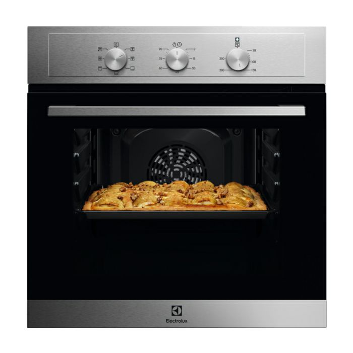 Electrolux EOH2H00BX Ugradbena pećnica serije 300 sa ventilatorom Kapacitet: 58 l Energetska klasa: A Boja: inox sa premazom protiv otisaka prstiju SurroundCook - ravnomjerno grijanje pećnice vrućim zrakom Mehanički prekidači i kontrole 7 funkcija Timer sa 2 podešenja Vrata sa 2 izolacijska stakla 1 plitica + 1 rešetka Pečenje u 2 razine Prikaz temperature: na regulatoru AquaClean - čišćenje uz pomoć vlage Dimenzije u cm: 59 V x 59,4 Š x 56 D Zemlja porijekla: Poljska