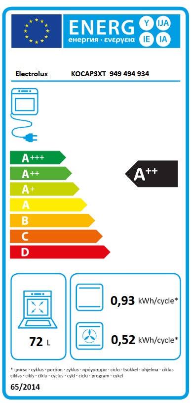 Klasa energetske učinkovitosti: A++ Indeks energetske učinkovitosti: 61.2 Potrošnja energije sa konvencionalnim načinom rada (kWh/ciklus): 0.93 Potrošnja energije u načinu rada s ventilatorom (kWh/ciklus): 0.52 Snaga žarulje (W): 65