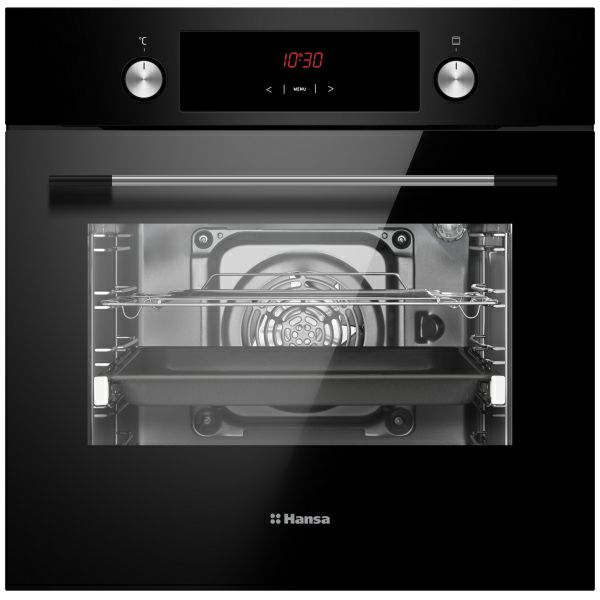 Hansa BOES68441 Električna pećnica sa 8 funkcija Programator Displej Konvekcija Brzo zagrijavanje Odmrzavanje Broj plehova: 1 Sustav lakog čišćenja vrata Broj stakala na vratima: 3 Reflektirajuće staklo Grill Push-pull tipke Ventilator Teleskopske vodilice na jednoj razini Recepti na vratima Kapacitet pećnice: 65 l Energetski razred: A Dimenzije: 595 x 595 x 575 mm Boja: crna