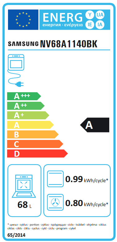 Samsung NV68A1140BK/OL Konvekcijska pećnica Boja pećnice: crna Staklo na vratima pećnice: trostruko Materijal unutrašnjosti: keramička caklina Zaključavanje za sigurnost djece Sat Vremensko mjerenje trajanja kuhanja Unutrašnja lampica: 25 W Kapacitet: 68 l Kvadratna posuda za pečenje Klasa energetske učinkovitosti: A Dimenzije (V x Š x D): 595 x 595 x 570 mm Težina (neto): 31.4 kg