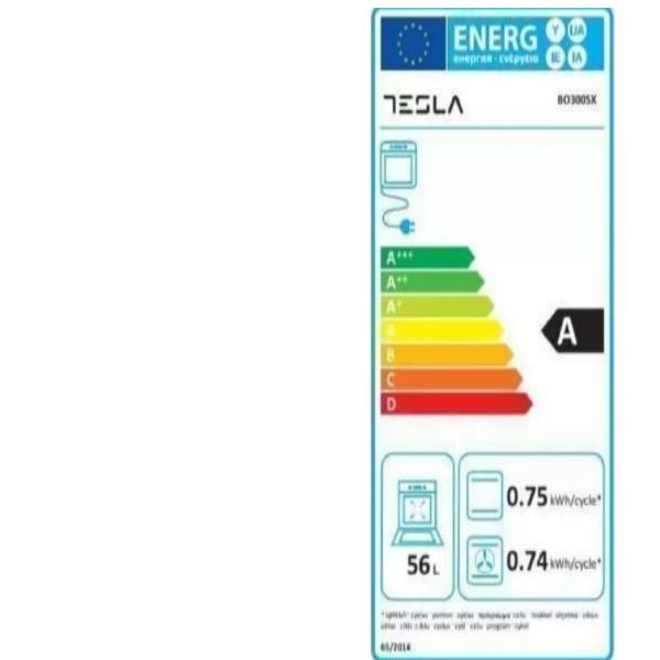 Kapacitet: 56 l Boja: inox Energetski razred: A Ventilatorska pećnica Upravljanje: mehaničko Broj funkcija: 5 1 rešetka, 1 posuda za pečenje Ukupna snaga: 2300 W Reljefne vodilice Čišćenje parom Potrošnja el. energije po ciklusu - statička/sa ventilatorom: 0,75 kW / 0,74 kW