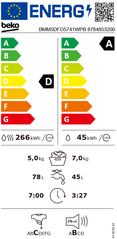 Beko BMM5DFO5741WPB Samostojeća perilica-sušilica rublja Kapacitet pranja: 7 kg Kapacitet sušenja: 5 kg Broj okretaja centrifuge: 1400 okr/min 15 programa ProSmart Inverter Motor - visoka učinkovitost, velika trajnost, mala buka Tehnologija Steam Cure AquaFusion AquaWave bubanj Baby Care Energetsa klasa: D Dimenzije (VxŠxD): 84,7 x 60 x 52 cm Težina: 60 kg
