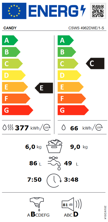 9 kg maksimalan kapacitet pranja 6 kg maksimalan kapacitet sušenja 1400 okr/min centrifuga 2D display + DIGIT tipke + programator SMART TOUCH - NFC povezivanje (Android) MIX POWER SYSTEM tehnologija 16 programa 4 brza programa (14'-30'-44'-59') Odgoda početka pranja/sušenja do 24 h KG DETECTOR funkcija EASY IRON funkcija pare 81 dBA emisija buke u fazi centrifugiranja (D klasa) E klasa energetske učinkovitosti pranja i sušenja C klasa energetske učinkovitosti pranja B klasa učinkovitosti centrifugiranja Dimenzije (VxŠxD): 85 x 60 x 58 cm