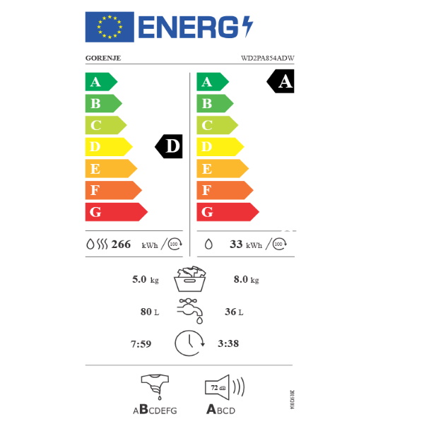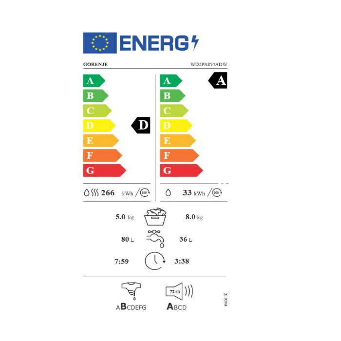 Razred energetske učinkovitosti pranja: A Razred energetske učinkovitosti sušenja: D Učinak centrifuge: B Razred buke centrifuge: A Razina buke centrifugiranje dB(A): 72 Boja: bijela Vrata: dvostruka Kut otvaranja vrata: 135 °