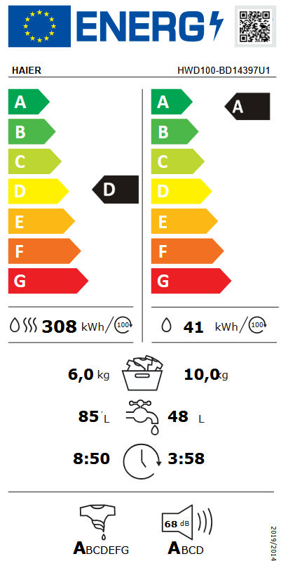 Razred energetske učinkovitosti za ciklus pranja (program ECO 40-60°C): A Razred energetske učinkovitosti za ciklus pranja i sušenja: D Razred učinkovitosti centrifugiranja: A Ponderirana potrošnja energije na 100 ciklusa za ciklus pranja (kWh): 41 Ponderirana potrošnja energije na 100 ciklusa za potpuni ciklus pranja i sušenja (kWh): 308 Trajanje programa ECO 40-60°C za nazivni kapacitet (hh:mm): 238 Trajanje ciklusa pranja i sušenja za nazivni kapacitet (hh:mm): 530 Razina buke tijekom faze centrifuge (dBA): 68 Razred emisije buke koja se prenosi zrakom: A Potrošnja vode po ciklusu pranja (program ECO 40-60°C) pri kombinaciji potpunog i djelomičnog kapaciteta (L): 48 Potrošnja vode po ciklusu pranja i sušenja (L): 85 Broj programa: 14 Odgoda početka do 24h Autodose Funkcija pare Napredno upravljanje na daljinu i dodatni sadržaj (Wi-Fi + BLE) Elektronika / zaslon: Touch Motor: Direct Motion Kapacitet pranja - pamuk (kg): 10 Kapacitet sušenja - pamuk (kg): 6 Maksimalna brzina centrifuge (rpm): 1400 Samostojeća Visina (mm): 850 Širina (mm): 595 Dubina (mm): 611 Neto težina (kg): 79