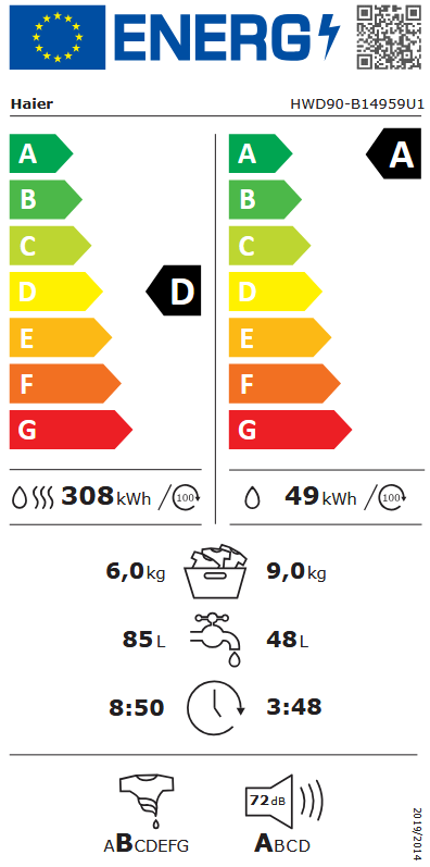 Razred energetske učinkovitosti za ciklus pranja i sušenja: D
