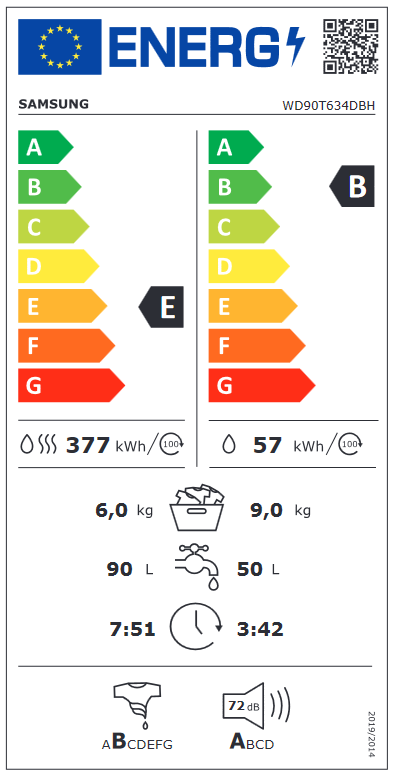 Kapacitet pranja (kg): 9 Kapacitet sušenja (kg): 6 Boja kućišta: bijela Razred energetske učinkovitosti: E Klasa učinkovitosti pranja: B Potrošnja energije (100 ciklusa): 377 kWh Potrošnja vode (ciklus): 90 l Učinkovitost centrifugiranja: B Razred emisije buke: A Razina buke (centrifugiranje): 72 dB AI Control AddWash Air Wash Brzina centrifugiranja: 1400 o/min Bubble Soak Tehnologija mjehurića Eco 40-60 program Wash and Dry Neto dimenzije (Š×V×D): 600 x 850 x 650 mm Ukupna dubina s vratima: 730 mm Neto težina: 68 kg WiFi ugrađen Podrška za aplikaciju SmartThings