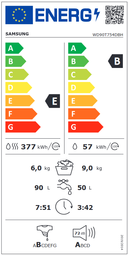 Kapacitet pranja: 9 kg Kapacitet sušenja: 6 kg Boja kućišta: bijela Klasa energetske učinkovitosti: E Klasa energetske učinkovitosti (samo pranje): B Potrošnja struje (100 ciklusa): 377 kWh Potrošnja vode (ciklus): 90 l Učinkovitost centrifugiranja: B Klasa emisije buke: A Razina buke (centrifugiranje): 72 dB AI Control QuickDrive AddWash Air Wash Brzina centrifugiranja: 1400 okr/min Bubble Soak Inverterski motor Zaključavanje za djecu Drum Clean+ Tip bubnja: diamond Neto dimenzije (Š×V×D): 600 x 850 x 650 mm Neto težina: 68 kg Dubina max: 740 mm WiFi SmartThings App Support