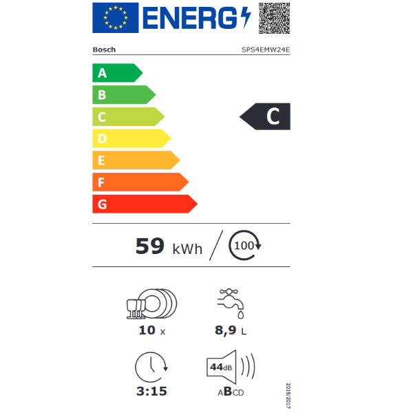Razred energetske učinkovitosti: C Potrošnja energije / vode: 59 kWh / 8.9 l Kapacitet pranja: 10 kompleta Trajanje programa: 3:15 (h:min) Buka: 44 dB(A) re 1 pW Razred emisije buke: B Buka (tihi program): 42 dB(A) re 1 pW