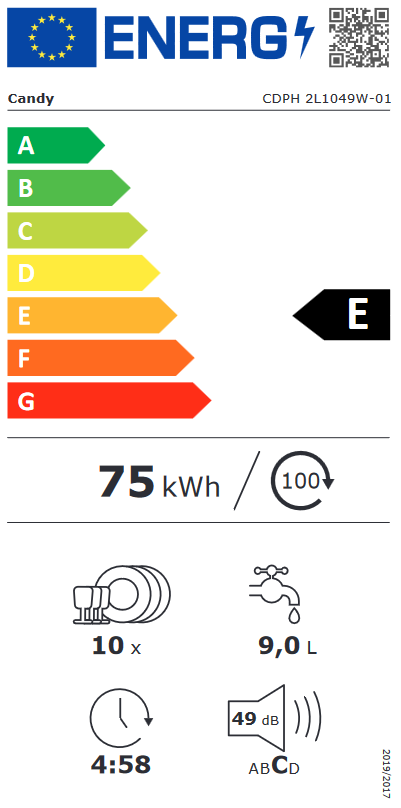 Samostojeća Broj kompleta: 10 Podesiva gornja košara Sustav sušenja: kondenzator Šarke: standard Maksimalna temperatura dovodne vode (°C): 60 Broj programa: 5 Pokazatelj završetka programa: zvučni signal Svjetlosni pokazatelj nedostatka soli Svjetlosni pokazatelj nedostatka sjajila Odgoda početka pranja: 3-6-9h Standard Water Protection Trajanje programa ECO (hh:mm): 4:58 Boja uređaja: bijela Razred energetske učinkovitosti: E Razred energetske učinkovitosti: C Razina buke (dBA): 49 Potrošnja energije za ECO program na 100 ciklusa (kWh): 75 Potrošnja vode po ciklusu pranja (ECO program) (l): 9 Visina (mm): 850 Visina bez gornje ploče (mm): 820 Širina (mm): 450 Dubina (mm): 580 Neto težina (kg): 38,41