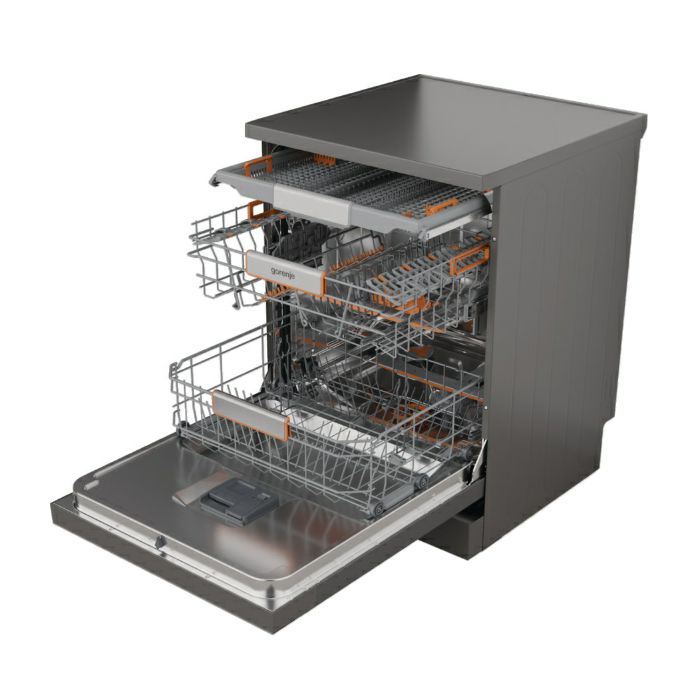 Gornja košara 2 široka stalka za noževe, 4 držača za šalice, Razdjelni držači, Držači čaša za vino od TPE-a, Foldable pin rows, 1 sklopivi držač za čaše, Foldable/dividable left CupHolder, Desna sklopiva polica CupHolder za čaše, Lijeva sklopiva polica CupHolder za čaše, Ručka s inox logotipom, Ručka, Široka mreža
