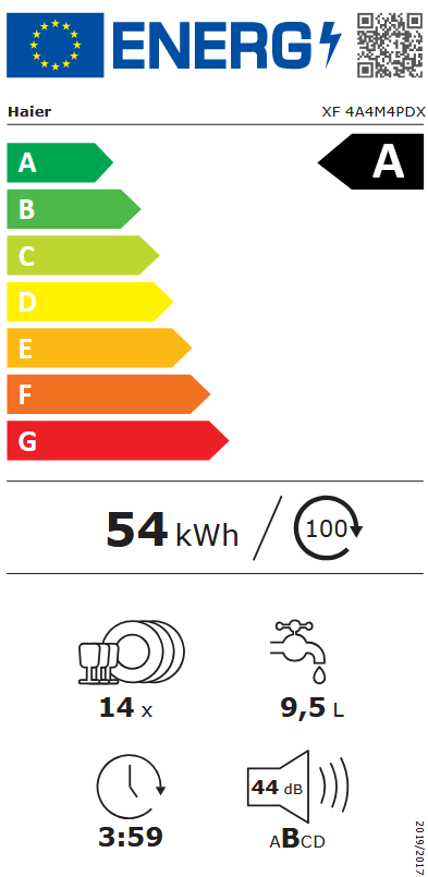 Razred energetske učinkovitosti: A Razred energetske učinkovitosti: B Razina buke (dBA): 44 Potrošnja energije za ECO program na 100 ciklusa (kWh): 54 Potrošnja vode po ciklusu pranja (ECO program) (l): 9,5 Boja uređaja: inox Podesive nožice Broj programa: 10 Automatski programi Pola punjenja Pokazatelj završetka programa Svjetlosni pokazatelj nedostatka soli Svjetlosni pokazatelj nedostatka sjajila Odgoda početka pranja: 1-23h Power Wash / Perfect Rapid Zone - treća mlaznica Standard Water Protection Total Water Block Napredno upravljanje na daljinu i dodatni sadržaj (Wi-Fi + BLE) IoT App: hOn SMART DOOR - automatsko otvaranje vrata Treća košara Podesiva gornja košara Sigurnosno zaustavljanje donje košare Sustav sušenja: Dry Boost Smart sensor sustav Maksimalna temperatura dovodne vode (°C): 60 Samostojeća Broj kompleta: 14 Visina (mm): 850 Visina bez gornje ploče (mm): 835 Širina (mm): 597 Dubina (mm): 598 Neto težina (kg): 53,2