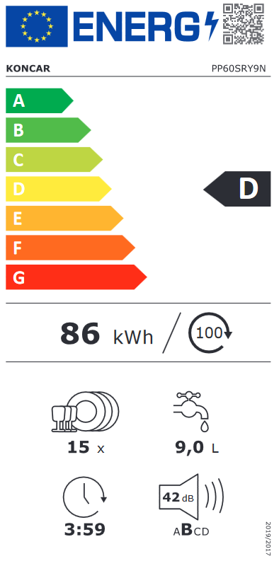 Končar PP60SRY9N Samostojeća perilica posuđa Boja: srebrna Broj kompleta posuđa: 15 Broj programa: 9 Temperature (°C): Bez grijanja-40-50-60-65-70 Upravljanje: elektroničko Sustav sušenja: turbo Zaštita od procurivanja Zaštita od pregrijavanja Programi: -Pretpranje -Eco -Brzo (30min 40°) -Auto intenzivno -Higijensko -Extra higijensko -55' 60 °C Pola punjenja Displej Pokazivač razine sredstva za sjaj Pokazivač razine soli Pokazivač ciklusa pranja Roditeljsko zaključavanje Podesiva gornja košara Broj polica za šalice: 2 Sklopivi držač tanjura donje košare Žičani prihvat košare Treća ladica za posuđe Podesiva polica za šalice Aquastop Razred energetske učinkovitosti: D Potrošnja vode (l): 9 Trajanje standardnog programa (h:min): 3:59 Potrošnja energije (kWh/100 ciklusa): 86 Potrošnja energije (kWh/ciklus): 0,86 Razina buke (dB): 42 Visina/ Širina/Dubina (cm): 85/60/60 Podesiva visina: 2 cm (pomoću PREDNJIH nogica) Ambalaža (V x Š x D ) (cm): 88,1/64,4/66,1 Bruto/Neto težina (kg): 49/46