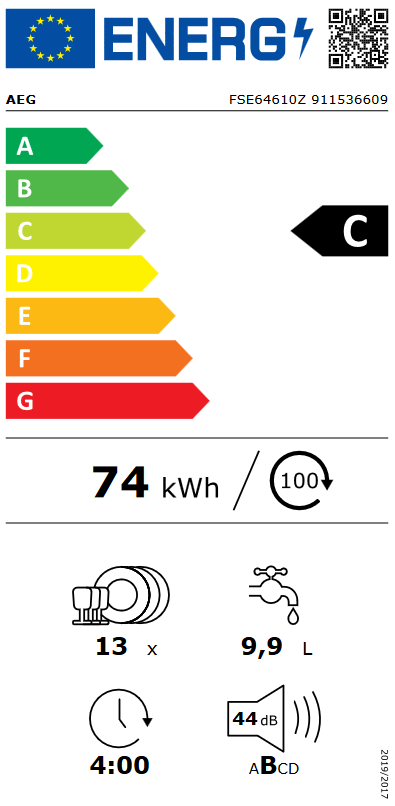 Energetski razred: C Razina buke: 44 dB Potrošnja struje na 100 ciklusa: 74 kWh Indeks energetske učinkovitosti: 43.9