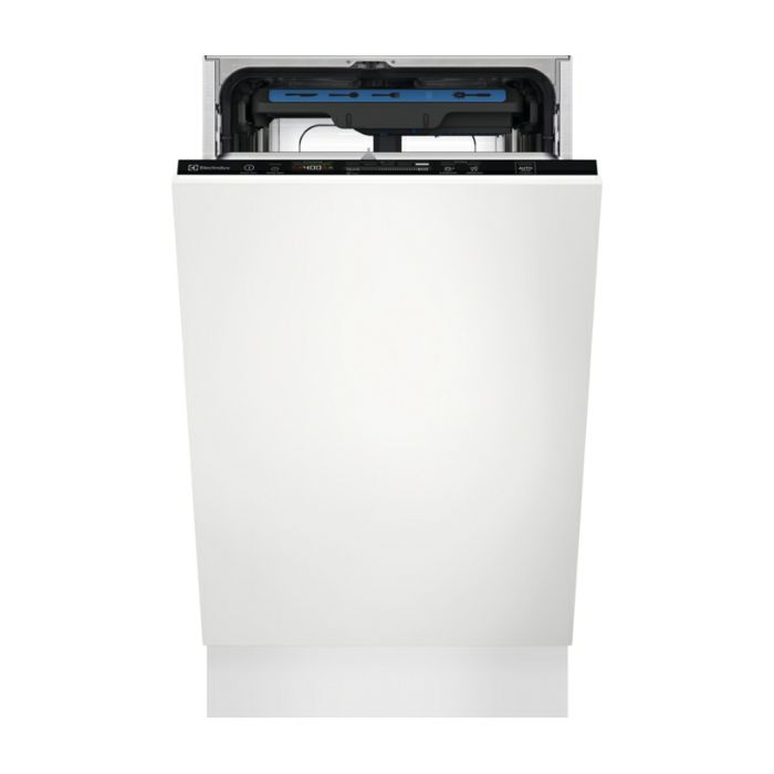 Electrolux EEM43200L Ugradbena Slimline perilica posuđa Širina: 45 cm Kapacitet: 10 kompleta Inverter motor Tihi rad: 44 dB Dizajn: potpuno integrirana Elektronske kontrole gore sa gumbima LED display BeamOnFloor projekcija na pod crvene ili zelene točke AirDry prirodno sušenje - auto otvaranje vrata Auto isključivanje QuickSelect - slider za optimalan odabir ciklusa Treća dodatna gornja mlaznica SatelliteClean doljnja mlaznica 5 razina prskanja 3 košare - dolje, mala FlexiLift, gore ladica za pribor MaxiFlex 8 programa 4 temperature: 45°-70° Programi: 160 minuta, 60 minuta, 90 minuta, AUTO Sense, Eco 50°, Machine Care, Brzi 30 minuta, Rinse & Hold, GlassCare System - Specijalna njega za staklo, XtraPower, Odgoda početka: 1 h - 24 h Indikator razine soli i sjajila Priključak tople vode do 60°C Aqua Control Klizne šarke Dimenzije u cm: 81,8 V x 44,6 Š x 55 D